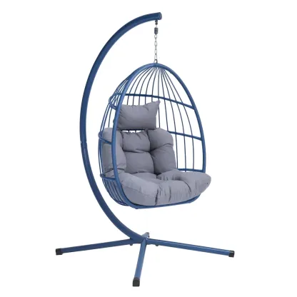 Fauteuil suspendu en forme d'œuf en métal bleu avec coussin gris